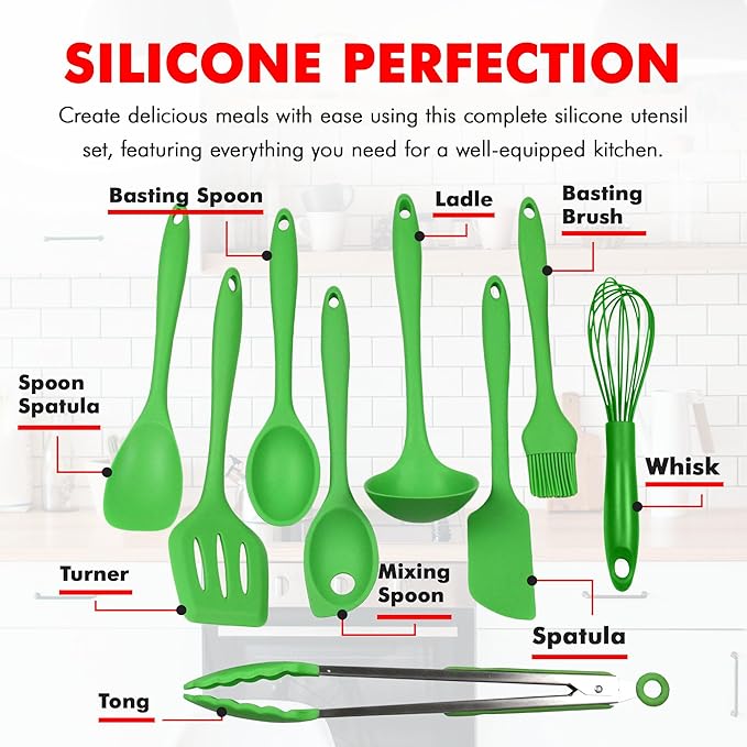 - This 9 piece silicone set includes a turner, basting spoon, mixing spoon, ladle, spatula, spoon, basting brush, tong, and whisk