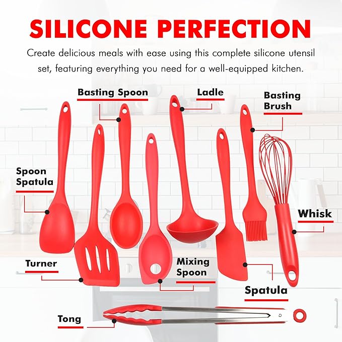 - This 9 piece silicone set includes a turner, basting spoon, mixing spoon, ladle, spatula, spoon, basting brush, tong, and whisk