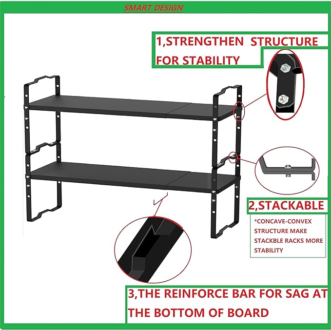 - ⭐【DURABLE &STRONG】- Cabinet Shelf Organizers is made of sturdy metal with anti rust coating,there is a metal support rod in the middle of these cabinet shelves,it can ensures the shelf didn’t get collapse when you place some heavy items on it,the screws at the metal rod are can be loose or tight to expand the countertop shelves