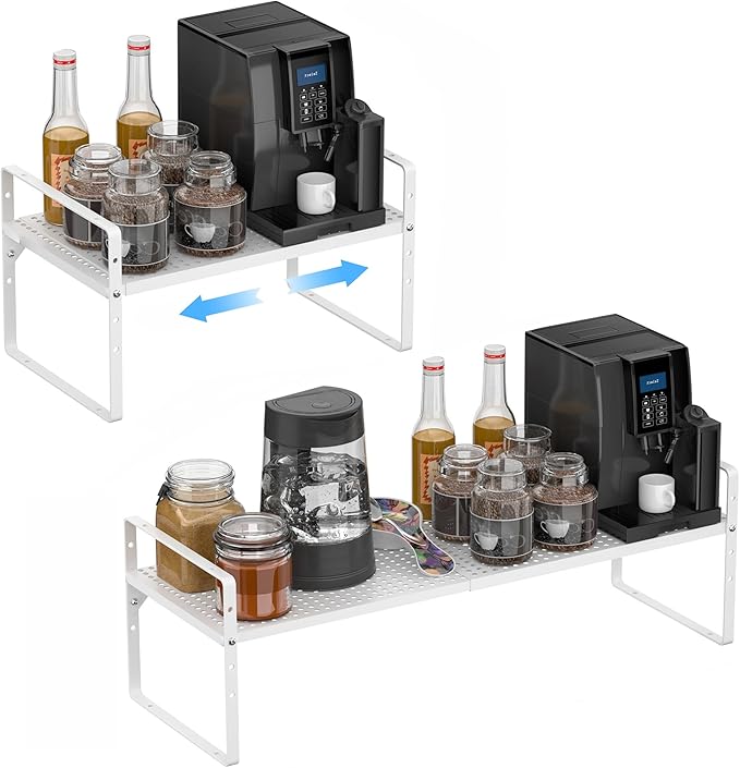 - 【Expandable and stackable design】--The Adjustable Countertop Organizer (collapsed) measures 16.5" L x 10.2" W x 9.8" H, expands from 16.5" to 27.5" wide. You can also stack two shelves together to create a two-tier storage space.