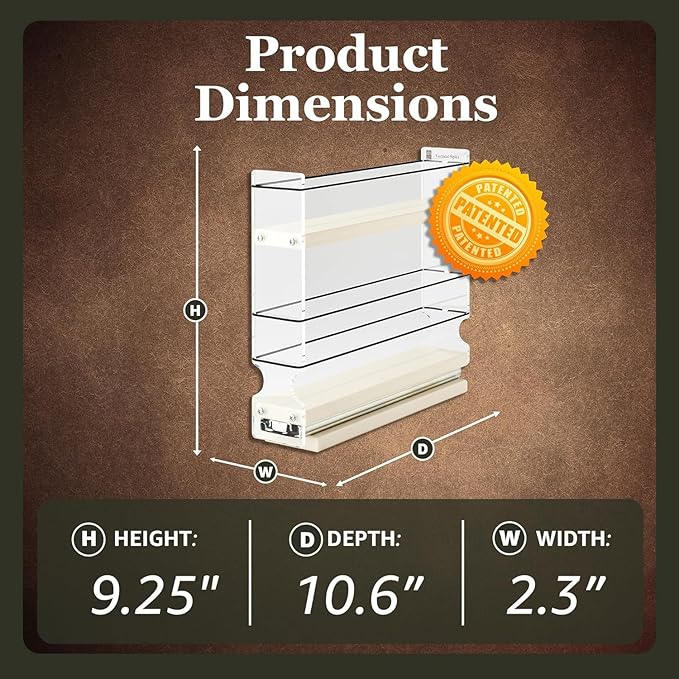 - COMPACT CABINET FIT: Optimally designed for space efficiency, this spice rack fits neatly into cabinets sized at least 2.3" wide x 9.5" tall x 10.6" deep. Its slim profile makes it perfect for maximizing storage in narrow kitchen or pantry spaces, effectively utilizing areas that typically go unused while providing easy and efficient access to your spices.