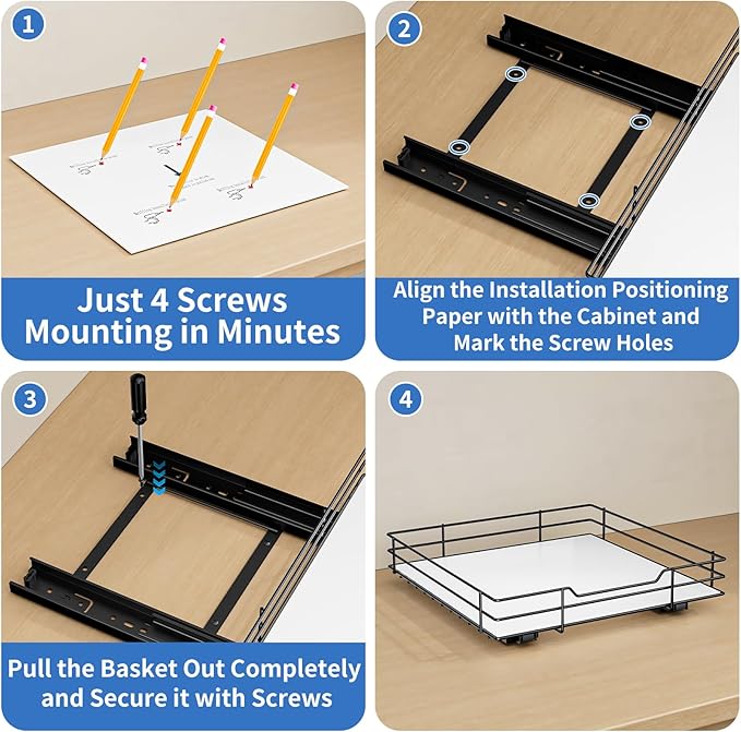 - Easy to Install: BOIVSHI slide out spice organization for cabinet measuring 10.5"D x 10.5"W x 2.5"H. Your cabinet space is at least 11 "W x 11 "D for installation and use. Please confirm your cabinet size before you order. Includes installation instructions and all necessary accessories. Simply tighten the 2 screws to install and you have a solid seasoning organizer in your cabinet.