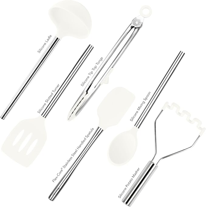 - COMPLETE KITCHEN ESSENTIALS: This silicone cooking utensils set includes six must have tools including a Deep Ladle Slotted Spatula Turner Tip Top Tongs Flex Core Spatula Scraper Mixing Spoon and Potato Masher for all your cooking needs from prep to serve