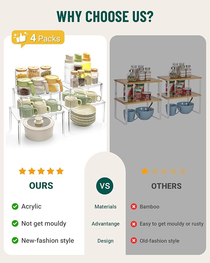 - Maximize Vertical Cabinet Organizer: This set of counter shelves are perfect for spice organization or as a counter organizer to store the seasoning, jars bottles, cans, cups, bowls, plates, cutlery, and more. Greatly vertical space optimization and makes your organization and storage aesthetically pleasing. Try this set of 4 cabinet organizer shelves and add the finishing touch to your kitchen storage with this space-saving solution!