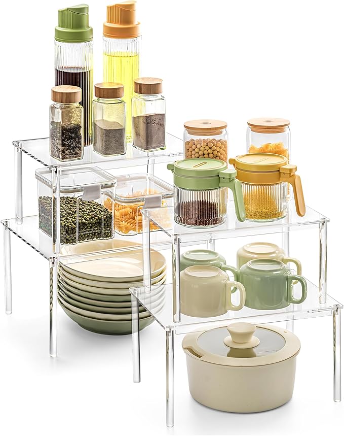 Acrylic Cabinet Organizer, Set of 4 Spice Rack Organizer for Cabinet, Desk Countertop Shelf Organizer, Pantry Kitchen Storage and Organization, Stackable Shelves House Essentials for Gift