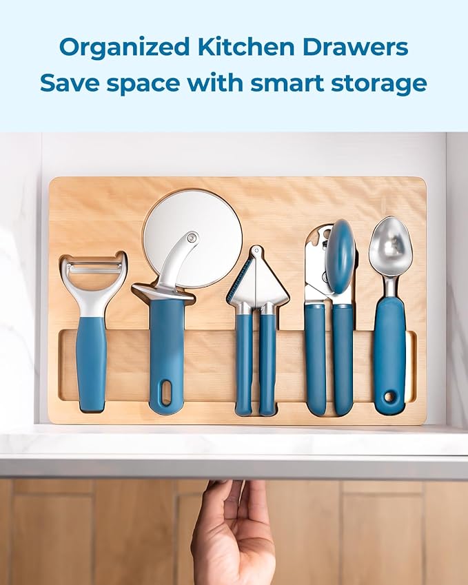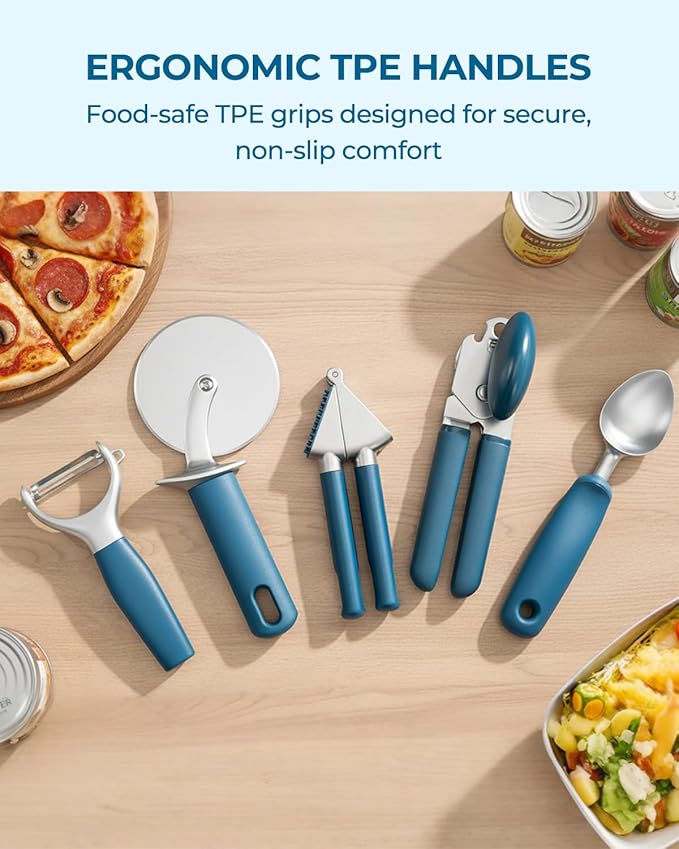 - ALL-IN-ONE KITCHEN SOLUTION: This 5-piece set includes a Can Opener, Pizza Cutter, Garlic Press, Ice Cream Scoop, and Vegetable Peeler, covering 95% of daily prep needs. One set replaces multiple single-use tools, saving both drawer space and cooking time.ing Utensil Set of 6