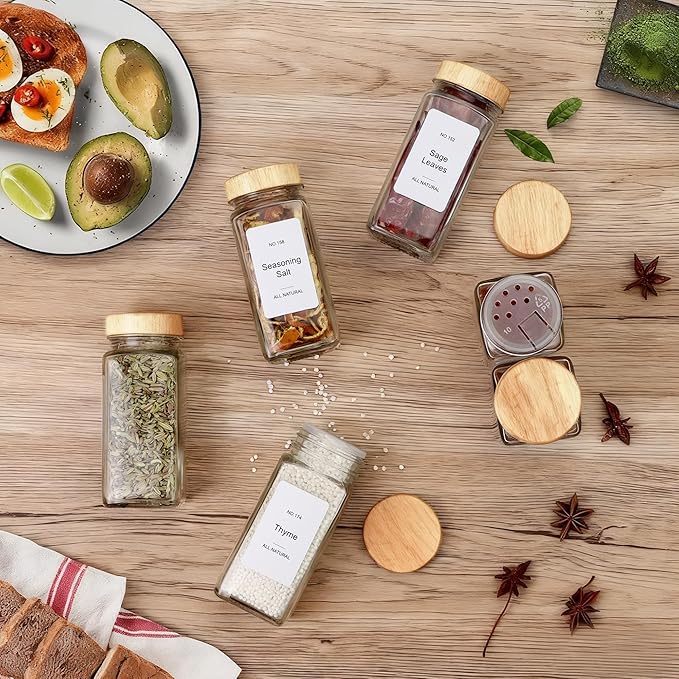 - 28 Glass Premium Spice Jars: Spice jars are made of lead-free glass, safe and shatter-resistance.28 dual functioning sift and pour lids; let you shake or use spoons to measure. The airtight aluminum caps protect prepared spices not exposed to air, keeping spices aromatic and flavorful.