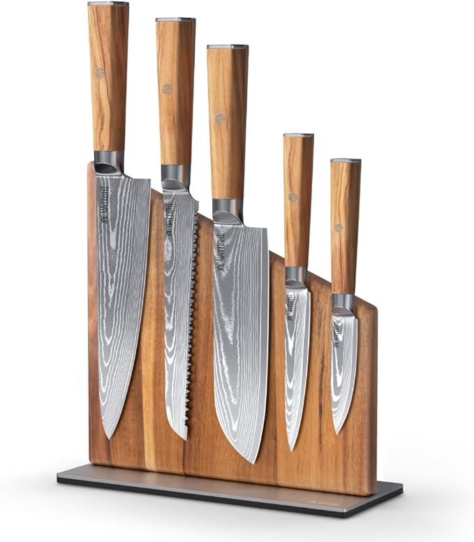 Yatoshi Knives Magnetic Kitchen Knife Block Set - Japanese 67 Layer High-Grade VG-10 Steel Knives, Sharp, Professional Kitchen Knife Set - Damascus (6 pieces), Olive Wood Handles