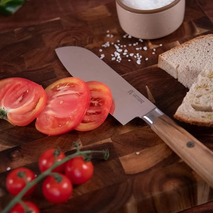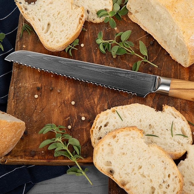 - Set Includes: 1x 8" Chef Knife, 1x 8" Bread Knife, 1x 7" Santoku Knife, 1x 5" Utility Knife, 1x 3.5" Paring Knife, 1x Magnetic Block