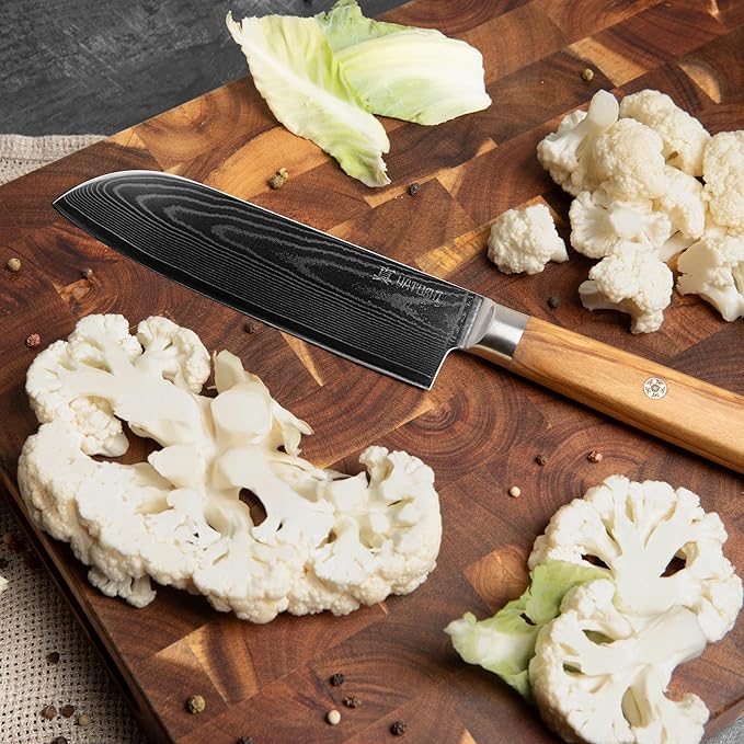 - High-Quality Blades: The blade features a VG-10 cutting core enveloped by 67 layers of stainless-steel Damascus cladding. With a Rockwell Hardness of 60-61, it boasts a meticulously hand-shaped Japanese double-bevel angled at 16° on each side.
